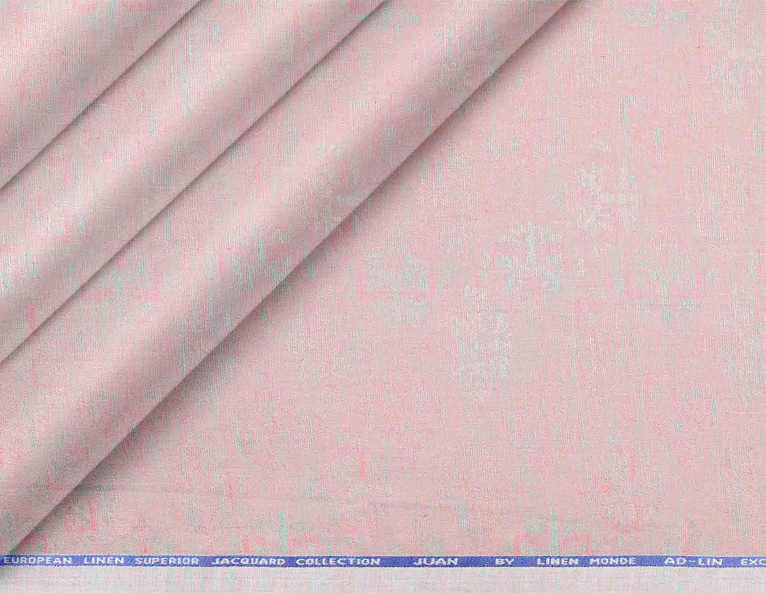 From the Superior Jacquard “Juan” Collection by Linen Monde, this 100% European linen fabric showcases a refined jacquard micro structure in a soft blush pink base subtly overlaid with mint and pastel tones, creating a delicate, high-fashion surface interest. Premium European linen offers a cool, breathable feel with a natural slub and elegant drape, making it ideal for elevated summer and destination dressing. Perfect for modern men’s Jodhpuris, bandhgalas and kotis, lightweight jackets, contemporary suits, and relaxed tailored trousers when interpreted in poly wool and blended constructions, this pastel jacquard brings a sophisticated yet easygoing charm. The blush–mint palette pairs beautifully with ivory, beige, and muted metallic accessories, making it a standout choice for daytime weddings, mehendi functions, and resort celebrations.