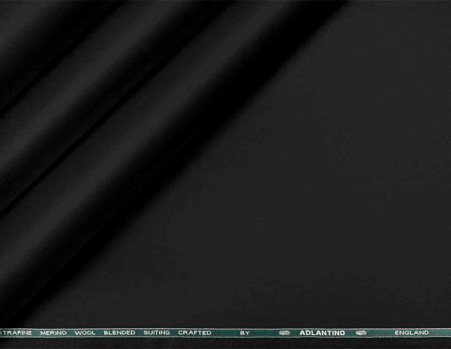 Adlantino Super 90’s extrafine merino poly wool suiting in a classic deep black shade with a refined plain micro structure, perfect for elegant Jodhpuris, Koti, jackets, suits and trousers for modern men.This fabric is a premium Super 90’s extrafine merino wool blended suiting crafted by Adlantino, featuring a smooth, subtle micro‑textured weave that delivers a rich, uniform surface with excellent drape and structure. The poly‑wool blend combines the natural comfort and breathability of merino wool with added strength and crease resistance from polyester, making it ideal for long ceremonial events, office wear and evening functions.The colour appears as pure deep black, giving a sharp, slimming and timeless look that pairs effortlessly with contrasting shirts, kurtas and accessories. This shade and construction make it highly suitable for regal Jodhpuri and bandhgala suits, Nehru/Koti jackets, structured blazers, full suits and well‑cut pants in versatile poly wool suiting for the contemporary wardrobe.