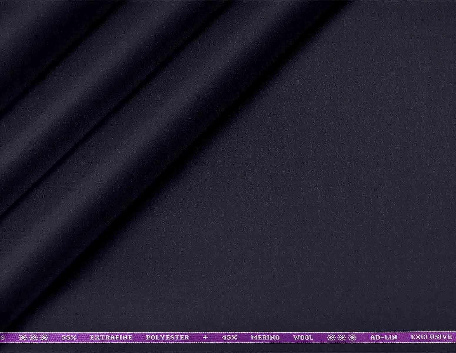 This image presents a sophisticated Raymond Celebs poly-wool suiting fabric, finished in a deep navy blue shade and crafted from 55% extrafine polyester with 45% merino wool in a plain microstructure. The rich, timeless colour and subtle texture create an elegant foundation for men’s formalwear, ideally suited for Jodhpuris, koti (waistcoats), jackets, tailored suits, and trousers. With its premium poly-wool blend, the fabric offers a balance of durability, comfort, and refined drape—perfect for contemporary men seeking style and versatility in their year-round wardrobe choices.