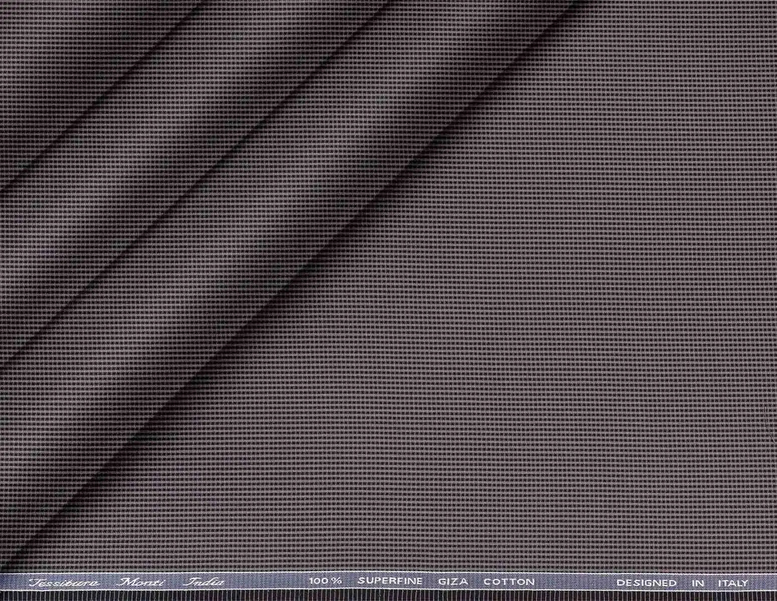 This fabric features a deep charcoal grey shade with a refined dot micro structure, giving a sophisticated textured effect that appears sleek and uniform from a distance while revealing subtle patterning up close. Woven by Tessitura Monti India in 100% superfine Giza cotton and designed in Italy, it offers a luxurious hand feel, excellent breathability, and a sharp, modern look that pairs effortlessly tailoring.Best used for premium shirts contemporary dark tone and understated pattern to modern men’s wardrobes while maintaining a crisp, polished appearance.