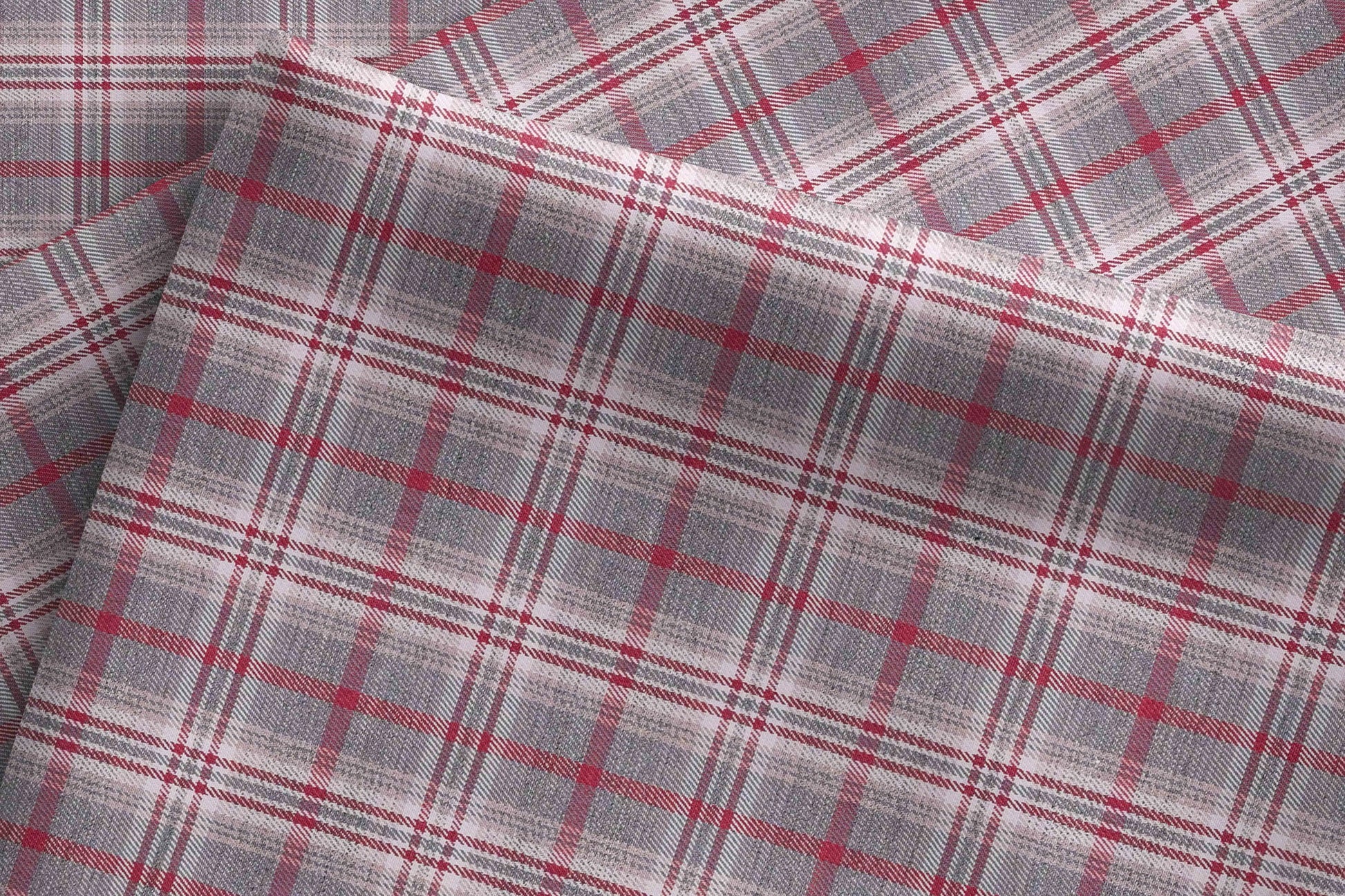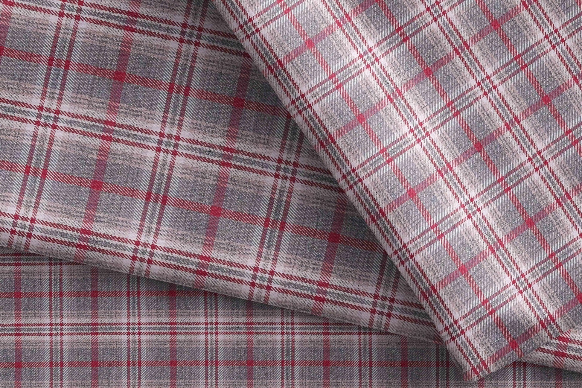 This striking Giza rich cotton shirting fabric from the Melange Retro Adlin Collection by Raymond features a soft grey melange base highlighted with wine and white tartan checks over a fine micro structure, creating a bold yet refined look that is perfect for smart-casual and weekend shirts, pairing effortlessly with denims and chinos while remaining breathable, lightweight, and comfortable for all-day wear.