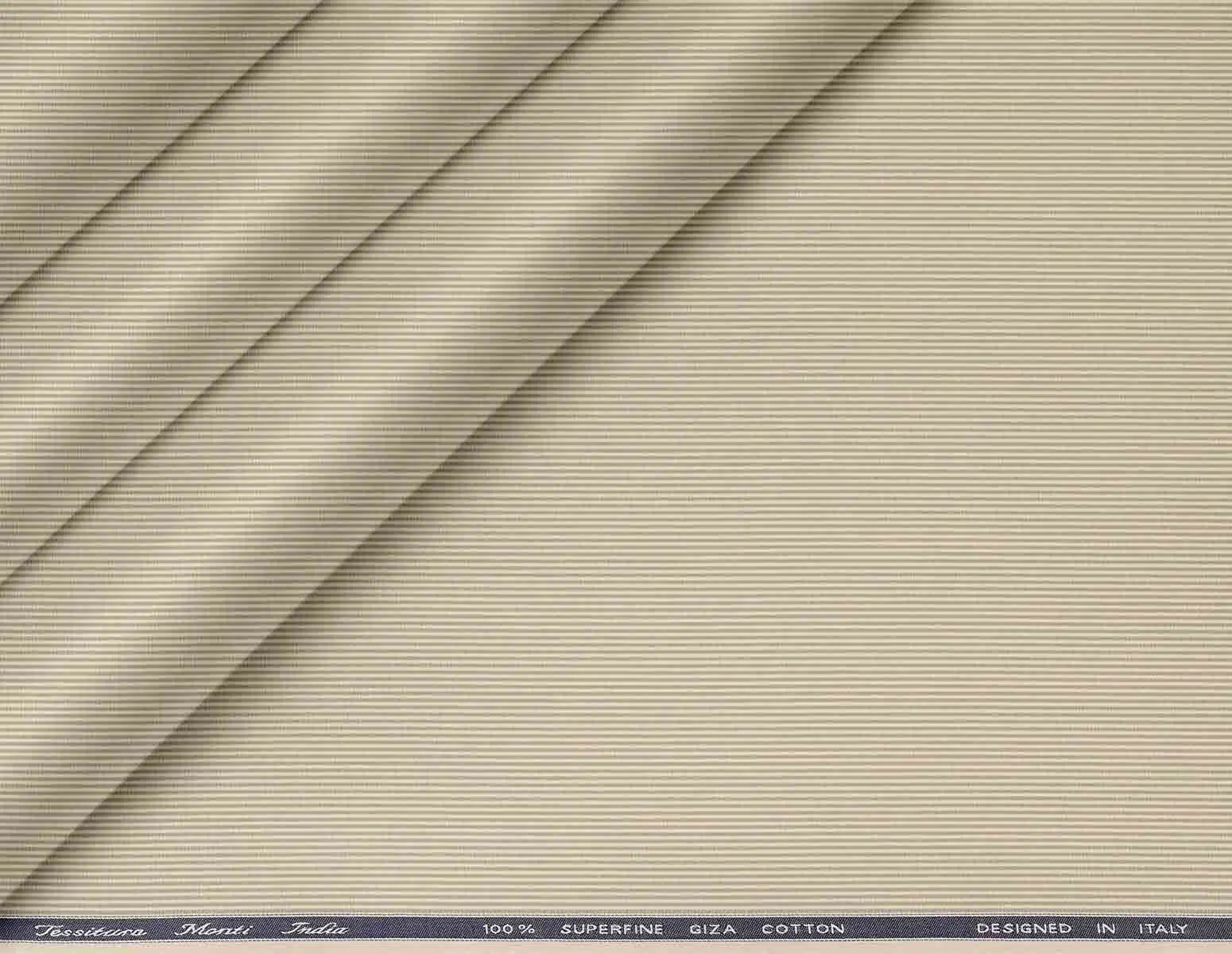 This fabric features a soft sand beige shade with a fine lining micro structure, creating a subtle stripe effect that adds depth while remaining refined and versatile for formal shirts. Woven by Tessitura Monti India in 100% superfine Giza cotton and designed in Italy, it offers a luxurious, breathable feel and coordinates effortlessly with a wide range. Best used for premium shirts introduces a sophisticated neutral tone with delicate linear texture to modern men’s wardrobes while maintaining a crisp, polished appearance.