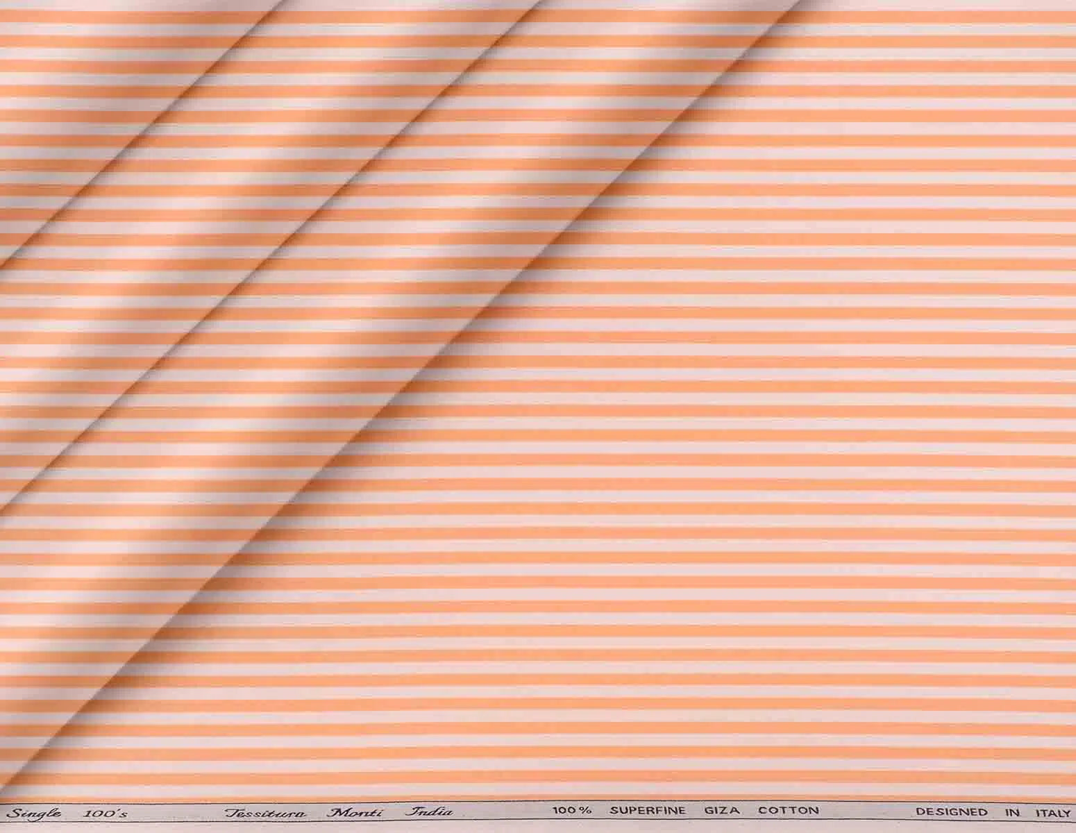 This Super Single 100’s shirting fabric from Tessitura Monti India is woven from 100% superfine Giza cotton, crafted to deliver the refined appearance of fine wool with the featherlight softness, breathability and comfort of luxury cotton. A sleek lining-inspired micro structure with evenly spaced horizontal stripes gives the cloth a crisp, contemporary character while remaining polished enough for formal and smart-casual shirts. With its smooth drape, fine yarn count and excellent stitch definition, it is ideal for bespoke and premium ready-to-stitch shirting for business, resort and weekend wear. The fresh apricot-peach and white stripe combination offers a vibrant yet sophisticated colour story that pairs beautifully with beige, stone, navy and light denim tailoring.