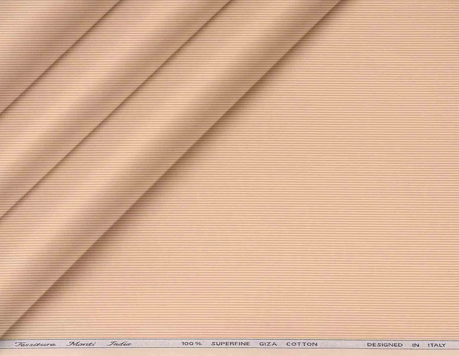 This fabric features a warm beige shade with a fine lining micro structure, creating soft horizontal stripes that give subtle texture and depth while maintaining a clean, elegant look. Woven by Tessitura Monti India in 100% superfine Giza cotton and designed in Italy, it offers a luxurious, breathable hand feel and pairs beautifully tailored separates. Best used for premium shirts to introduces a sophisticated neutral tone and refined linear pattern to modern men’s wardrobes while keeping the overall appearance crisp and polished.