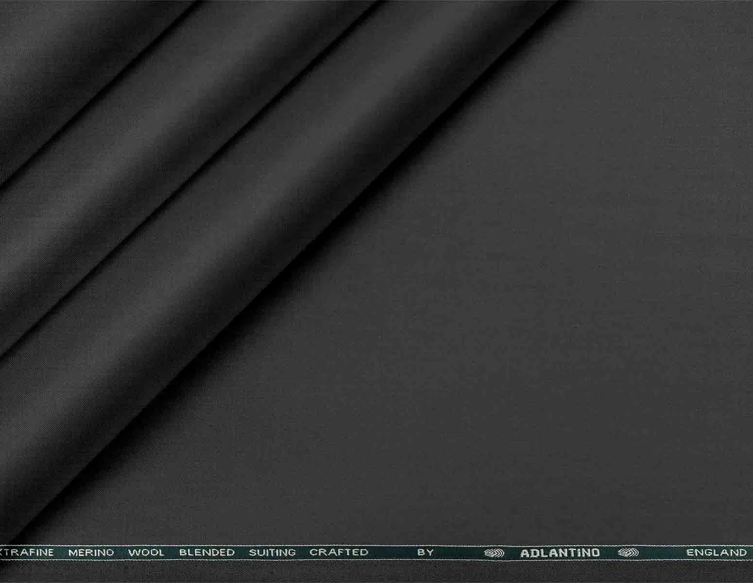 Charcoal grey poly wool suiting fabric with a refined plain micro structure, woven from Super 90’s extrafine merino wool blend and crafted by Adlantino England for a smooth, sophisticated drape. This deep charcoal shade is perfect for creating smart Jodhpuris, Nehru-style kotis, sharp jackets, formal suits and well-tailored trousers, ideal for the modern man’s everyday and occasion wear wardrobe.
