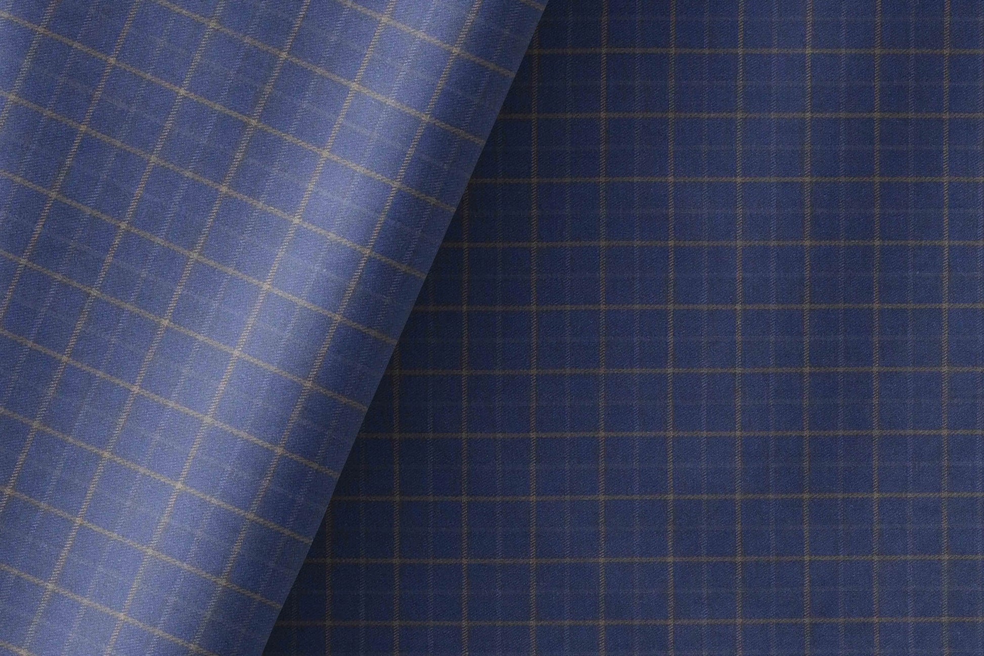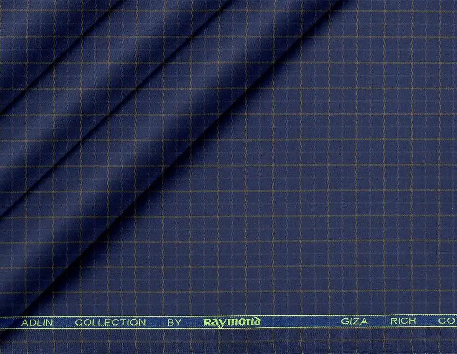 From the Ross Adlin Collection by Raymond, this Giza rich cotton fabric features a refined micro check structure on a deep royal navy base highlighted with subtle ochre lines, creating a smart yet understated pattern ideal for modern tailoring. The Giza-rich cotton yarns deliver a smooth hand feel, breathable comfort, and a crisp fall, ensuring garments retain a polished shape through extended wear.