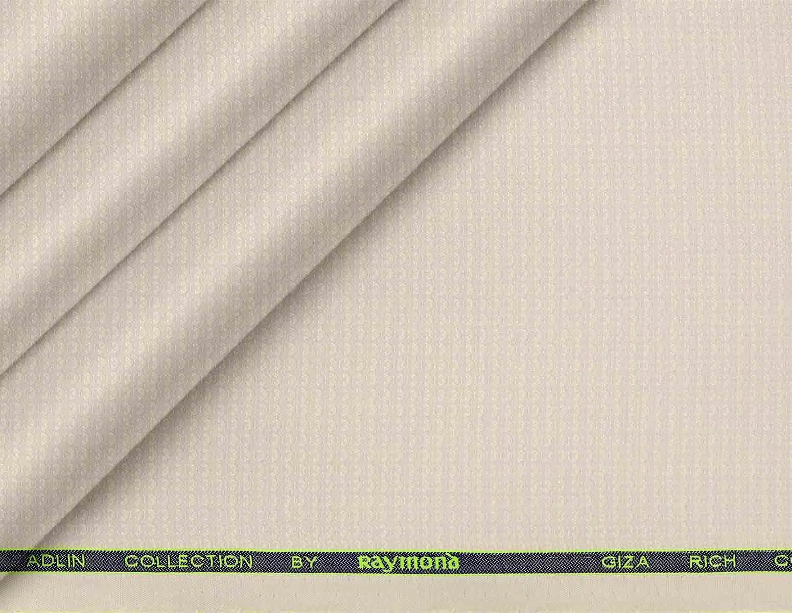 This Adlin Collection by Raymond Giza Rich Cotton fabric comes in a soft beige shade with an elegant all-over woven micro pattern that adds quiet texture and a subtle sheen, offering a smooth, silky hand feel, excellent breathability, and beautiful drape, making it ideal for premium formal and office shirting where refined look, day-long comfort, and durability are essential.
