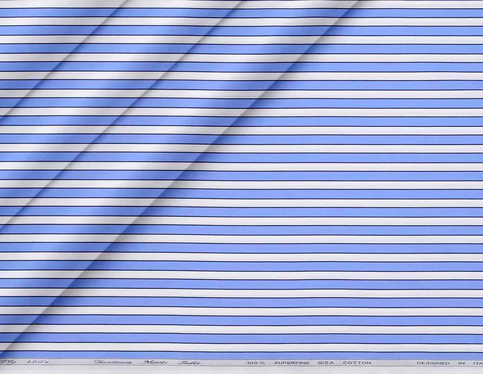 This Super Ply 120’s fabric from Tessitura Monti India is woven from 100% superfine Giza cotton and features clean sky blue and navy horizontal stripes that create a sleek, micro-structured effect on the body. The superfine Giza yarns provide a smooth, silky handle, breathable comfort, and a gentle sheen, making the fabric ideal for refined warm-weather and all-season occasionwear. The fresh sky-blue base with sharp navy striping works beautifully for modern men’s when interpreted inblended constructions. Its crisp, nautical-inspired palette pairs effortlessly with whites, greys, and deeper blues, delivering a sophisticated yet youthful look for daytime functions, resort ceremonies, and semi-formal events.