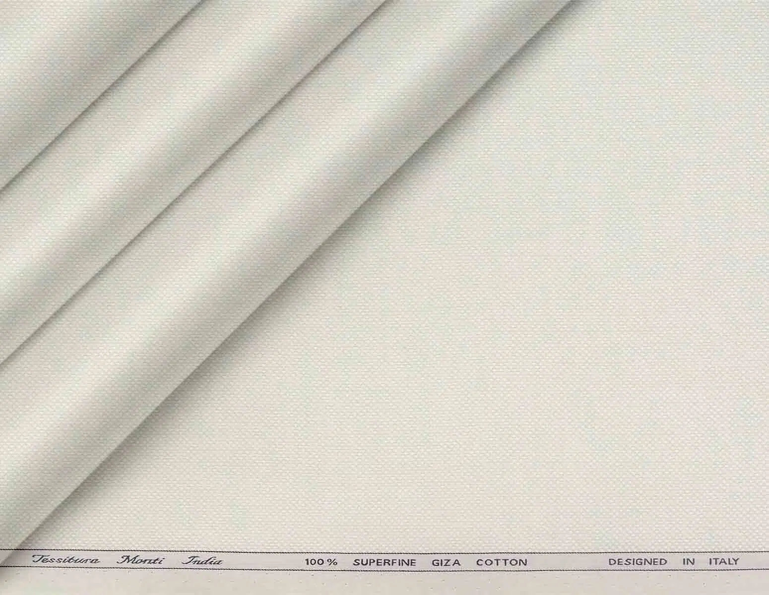 This sophisticated shirting fabric from Tessitura Monti India is woven from 100% superfine Giza cotton, developed to mirror the refined appearance of wool while offering breathable lightness and a silky-smooth hand feel. A delicate dot micro structure, created by tiny, evenly spaced motifs, lends subtle texture and depth to the cloth yet keeps the overall look clean and ultra-refined, making it ideal for formal and business shirts. With its fluid drape and crisp stitch definition, the fabric tailors beautifully into sharp collars, cuffs and plackets for bespoke and premium ready-to-stitch shirting. The colour is an elegant soft ivory-cream with tonal micro dots, providing a fresh alternative to plain white and pairing effortlessly with navy, charcoal, beige and pastel tailoring.