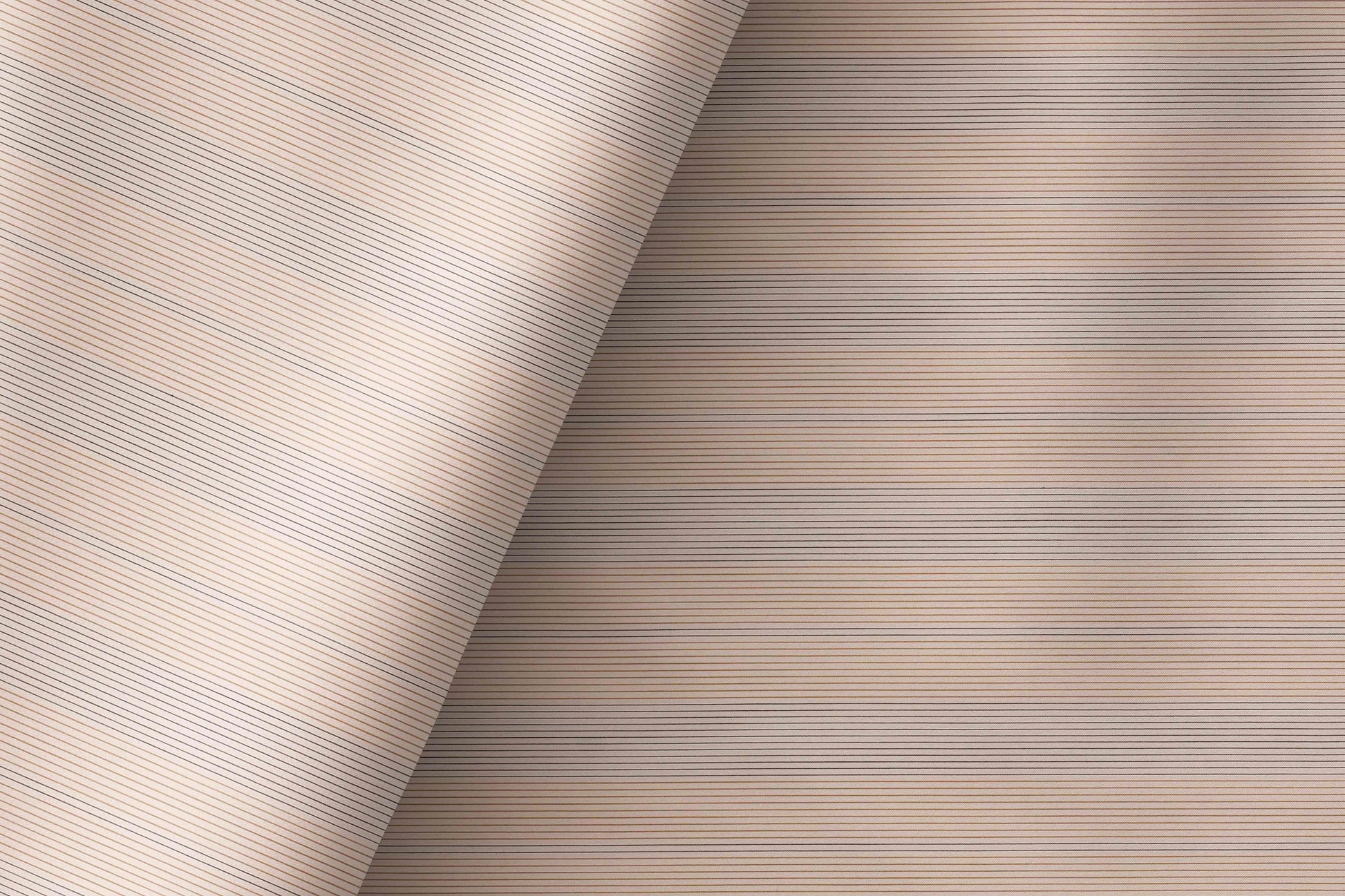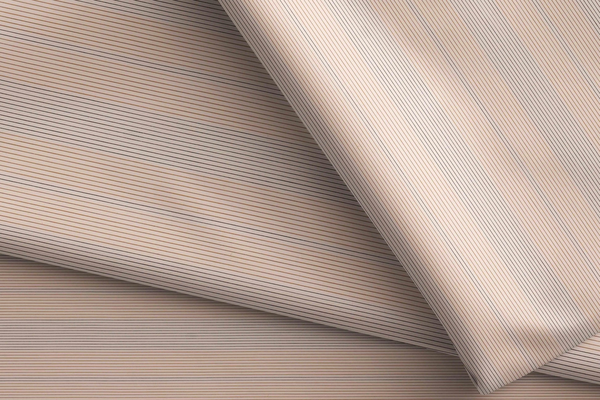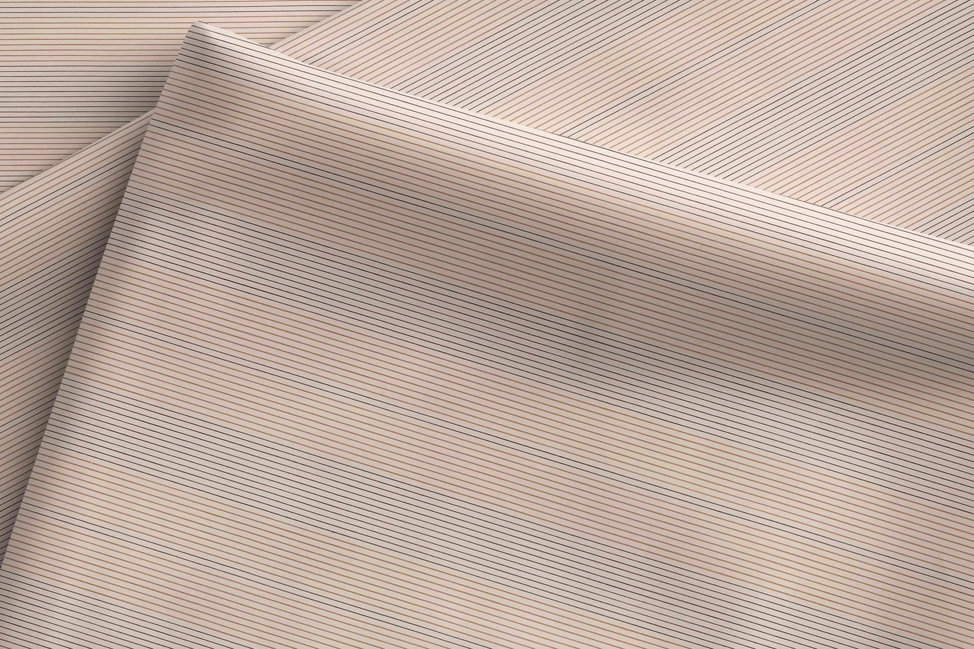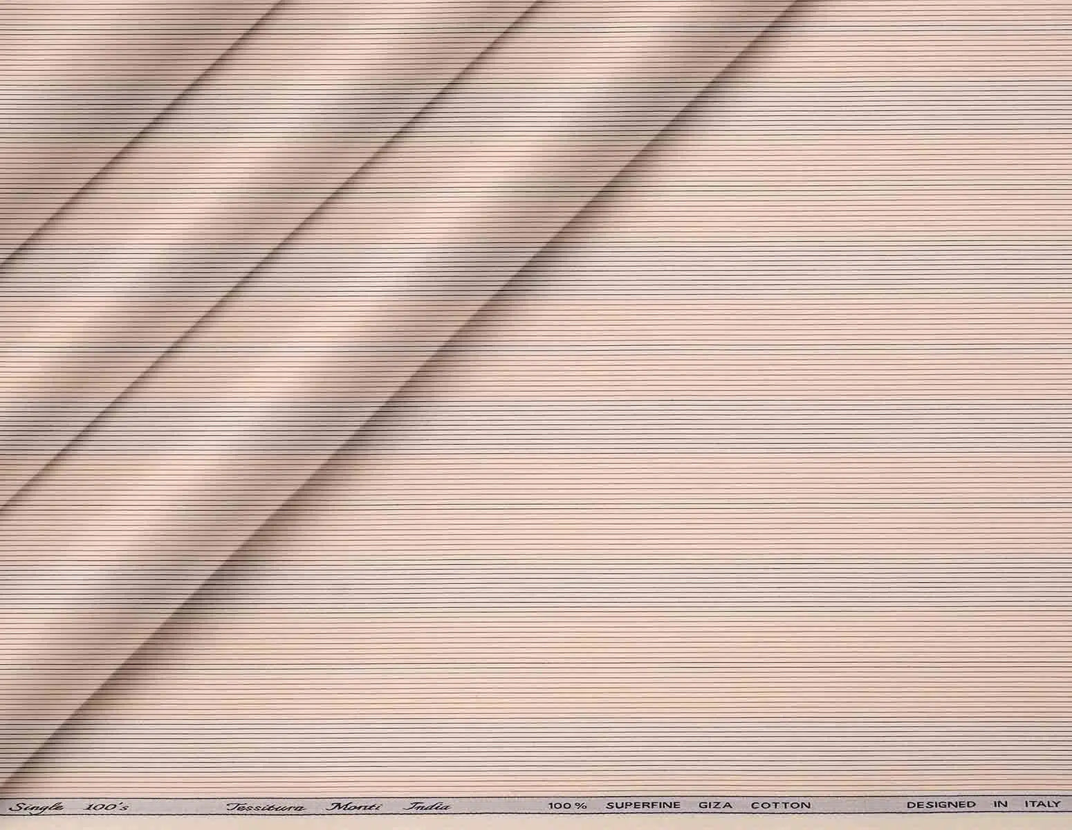 This refined Single 100’s shirting fabric from Tessitura Monti India is crafted from 100% superfine Giza cotton, engineered to echo the smooth, dry hand of fine wool while maintaining exceptional breathability and lightweight comfort. A clean lining-style micro structure with ultra-fine horizontal pinstripes gives the cloth a sleek, tailored surface that reads almost solid from a distance yet reveals subtle detailing up close, perfect for understated luxury shirts. With its fluid drape, high yarn count and excellent stitch definition, this fabric is ideal for bespoke and premium ready-to-stitch shirting for business, travel and smart-casual wear. The colour is a warm sand-beige base delicately lined with tonal darker beige stripes, offering a versatile, contemporary palette that pairs effortlessly with navy, stone, white and classic denim.